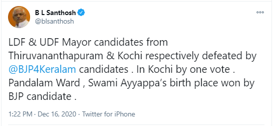 Kerala Local Body Polls: The BJP candidates have defeated LDF and UDF Mayor candidates in Thiruvananthapuram and Kochi respectively. In Kochi, by one vote. Pandalam Ward, Swami Ayyappa’s birth place won by BJP candidate, says BJP's BL Santhosh