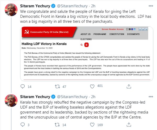 Sitaram Yechury today said that the LDF has won a majority in all 3 panchayat tiers. Yechury said Kerala has strongly rebuffed the negative campaign by the UDF and the BJP.