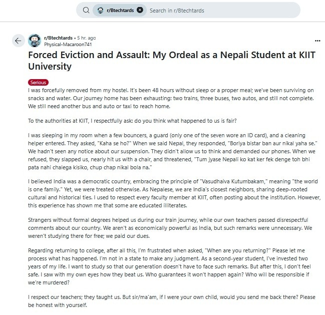 A second-year student from Nepal has shared a distressing account of their removal from the hostel at Kalinga Institute of Industrial Technology (KIIT) on Reddit, the student wrote, “I was forcefully removed from my hostel. It’s been 48 hours without sleep or a proper meal; we’ve been surviving on snacks and water.”