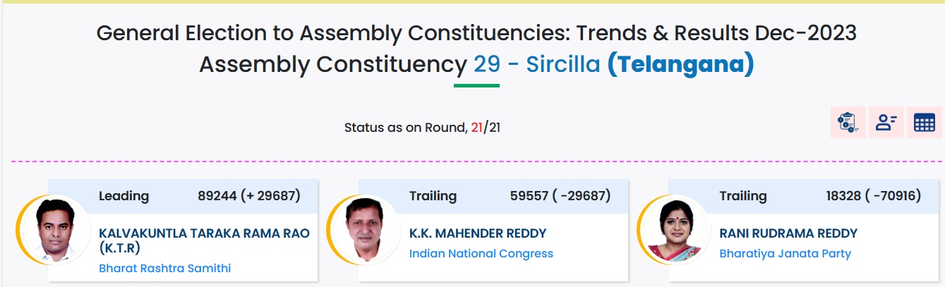 BRS is leading by a huge margin of 29,687 in round 21 of the Sircilla constituency, gathering a total of 89,244 votes as of 4:23 AM.