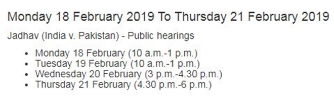 The hearing at the ICJ will begin at 2:30 pm (IST). The hearing will start with India making its argument. On Feb 19, Pakistan will fill its reple. On Feb 20th, India will again be given a change to submit its reply. The hearing will conclude on Feb 21 with final submission made by Pakistan.