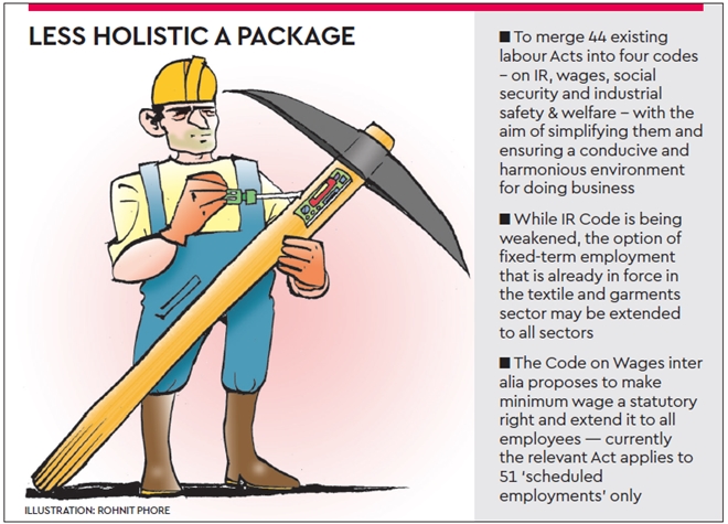The Modi government’s labour reforms agenda, in fact, has been holistic. As many steps are regarded as industry-friendly, the proposed codes also seek to enhance the workers’ privileges. The code on wages, for instance, proposes making minimum wage a statutory right and extending it to all employees — currently the relevant Act applies to 51 “scheduled employments” only. In what is expected to reduce the disparity in minimum wages across states, the central government will notify a “national minimum wage” (below which no state can fix its minimum wages) and this will be revised every two years (five years if the dearness allowance becomes part of the minimum wages).