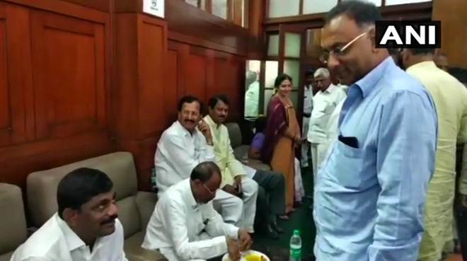 – Congress MLA Pratap Gowda Patil having lunch at Vidhana Soudha, Congress’s DK Suresh and Dinesh Gundu Rao present with him. (See pic)