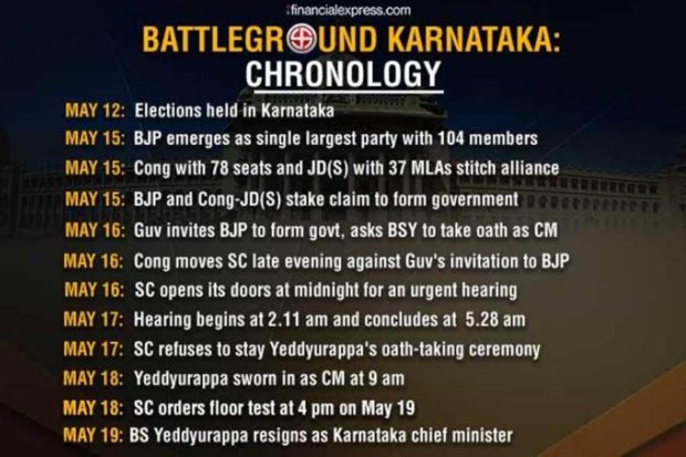 – The Supreme Court has ordered a floor test in the Karnataka Assembly at 4 PM on Saturday, drastically slashing the 15-day window given by the Governor to Yeddyurappa to prove majority.