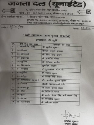 Among the alterations, sitting MPs were replaced in Sitamarhi and Siwan constituencies. Devesh Chandra Thakur, the legislative council chairman, will represent JD(U) in Sitamarhi, while Vijay Laxmi Kushwaha secured the ticket for Siwan after joining the party with her husband, Ramesh Singh Kushwaha, the former state president of Rashtriya Lok Morcha, an NDA ally.
