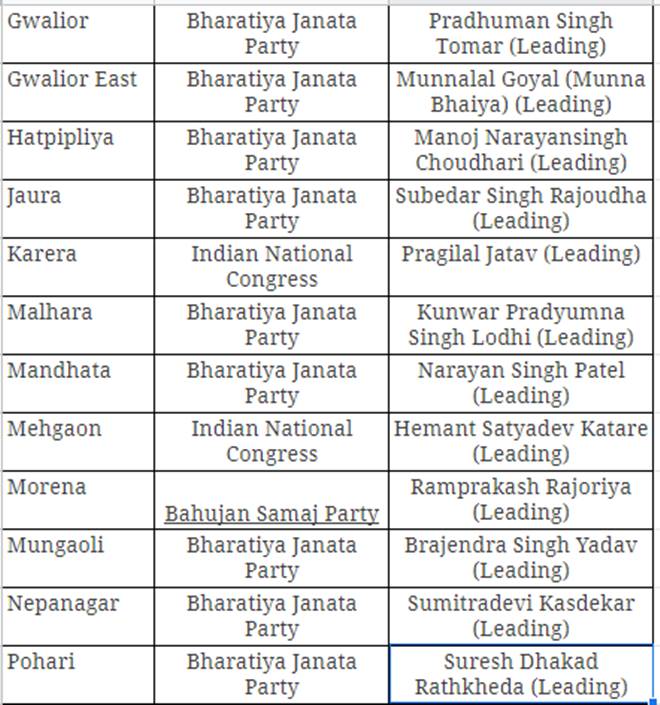 The bypolls were held for assembly constituencies in Joura, Sumawali, Morena, Dimani, Ambah, Mehgaon, Gohad, Gwalior, Gwalior East, Dabra, Bhander, Karera, Pohari, Bamori, Ashok Nagar, Mungaoli, Surkhi, Malhara, Anuppur, Sanchi, Biaora, Agar, Hatpipliya, Mandhata, Nepanagar, Badnawar, Sanwer and Suwasra.