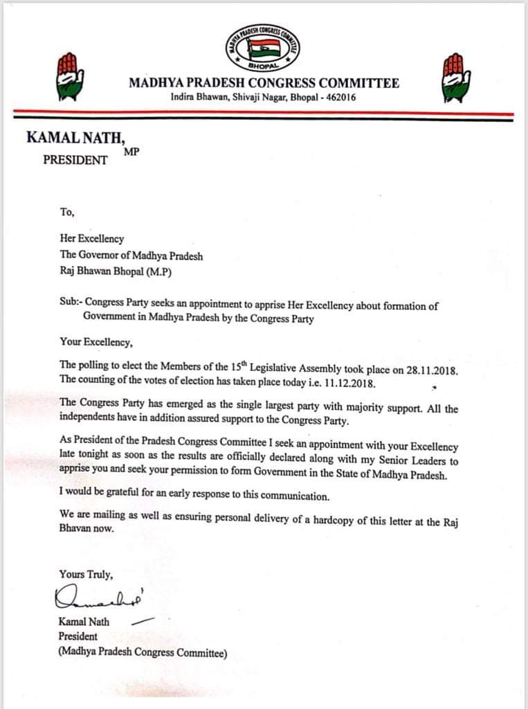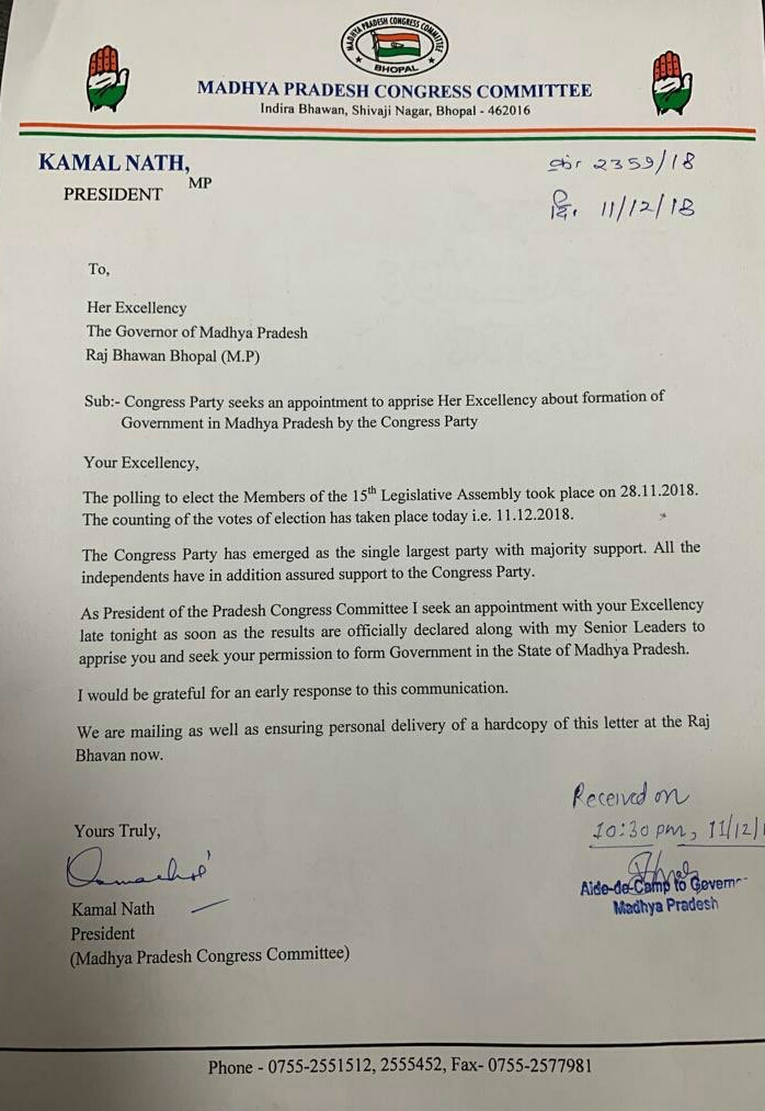 Congress party will go to the Governor House and has sought an appointment late tonight with the Governor to stake their claims to form the govt in the state. The party has sought appointment by sending an email and a fax too. State Party President, Kamal Nath, said in a letter.