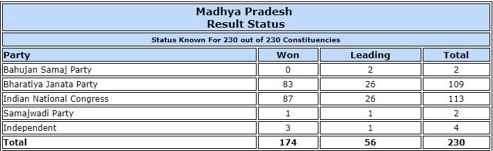 The Congress has won 114 seats in 230 seats Assembly in Mashya Pradesh. The magic figure to form government is 116. The BJP, which was in the power since 2003, won 109 seats. The Samajwadi Party has announced that the its lone MLA will support the Congress. The BSP of Mayawati had contested elections solo and won 2 seats.