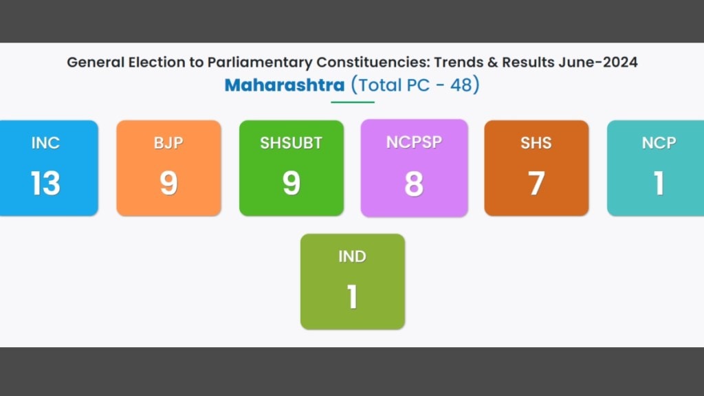 The result for the state has been announced and the Congress has won the maximum seats in the state. The INC won 13 seats, while the BJP and Shiv Sena (UBT) won 9 each. Union Minister Piyush Goyal won by a margin of 357608 votes from Mumbai North. Besides him, Nitin Gadkari won from Nagpur by a margin of 137603 votes.