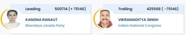 BJP‘s star candidate and first-time contender Kangana Ranaut from Mandi has taken a massive lead by over 73,000. Congress candidate Vikramaditya Singh, whose mother Pratibha Singh is the sitting MP from Mandi, is staring at a glaring defeat.