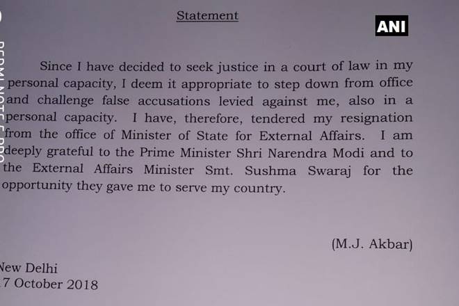 “Since I have decided to seek justice in a court of law in my personal capacity, I deem it appropriate to step down from office and challenge the false accusations levied against me, also in personal capacity. I have, therefore, tendered my resignation from the office of Minister of State For External Affairs,” Akbar said in a written statement shared by news agency ANI.