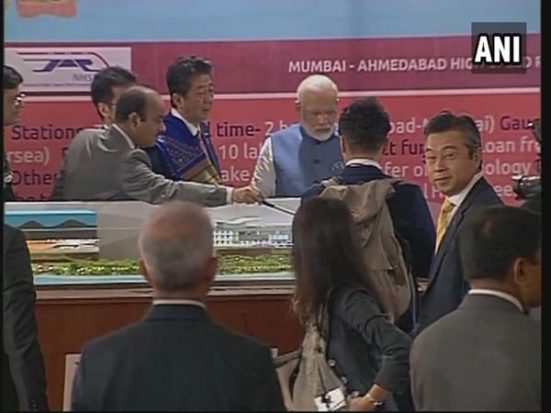 8:12 AM: PM Narendra Modi and PM Abe will shortly lay the foundation stone for the high-speed train project between Ahmedabad and Mumbai which is expected to be completed by 2022. The train would cover the distance of over 500 km in around two hours.