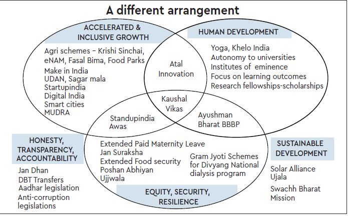 Each of these is represented by a circle (see graphic). Almost all flagship programmes of the government can be placed in one or more of these categories. That is why there are overlapping or intersecting circles. Further, all three circles are circumscribed by a boundary that characterises two key principles: (1) honesty, transparency and accountability, and (2) sustainable development.