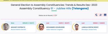 BRS’s Maganti Gopinath is leading with 31582 votes in round 11 of 26 in Jubilee Hills as of 3.50 pm. INC’s Mohammed Azharuddin trailing in Jubilee Hills constituency.