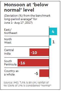 Region-wise, north-west India and east and the North-East have received ‘normal’ rainfall of 101% and 104% of LPA, respectively. Central India has received rains 90% of LPA, which falls in the ‘below normal’ category. In case of the southern peninsula, the rainfall so far has been 84% of LPA, which is in the ‘deficient’ category. Out of the 36 sub-divisions in the country, five have received ‘excess’ rainfall, 22 got ‘normal’ rains, while only nine received ‘deficient’ rains.
