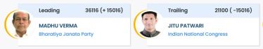 BJP’s Madhu Verma is leading against Congress’ Jitu Patwari by a margin of 16931 in the Rau constituency.