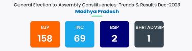 The Bharatiya Janata Party (BJP) is leading in 158 seats and Congress is leading in 69 seats in the 2023 Madhya Pradesh Assembly Election results, as per ECI trends.