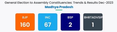 The Bharatiya Janata Party (BJP) is leading in 160 seats and Congress is leading in 67 seats in the 2023 Madhya Pradesh Assembly Election results, as per ECI trends.