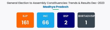 The Bharatiya Janata Party (BJP) is leading in 161 seats and Congress is leading in 66 seats in the 2023 Madhya Pradesh Assembly Election results, as per ECI trends.