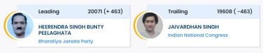 BJP’s Heerendra Singh Bunty is leading by a margin of 463 votes against Congress’ Jaivardhan Singh in Raghogarh constituency.
