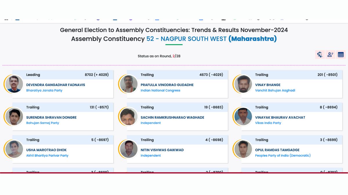 The Election Commission of India will announce the results for the Maharashtra elections today. You can access the results here: https://results.eci.gov.in/. The trends for the Nagpur South West Assembly elections will start coming in shortly.
