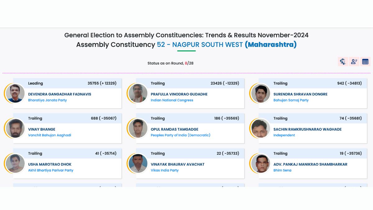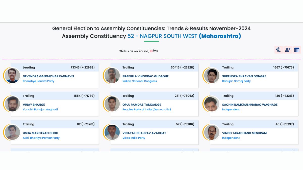 After 16 out of 28 rounds of counting, Devendra Gangadhar Fadnavis of the Bharatiya Janata Party (BJP) is leading with 73,343 votes.