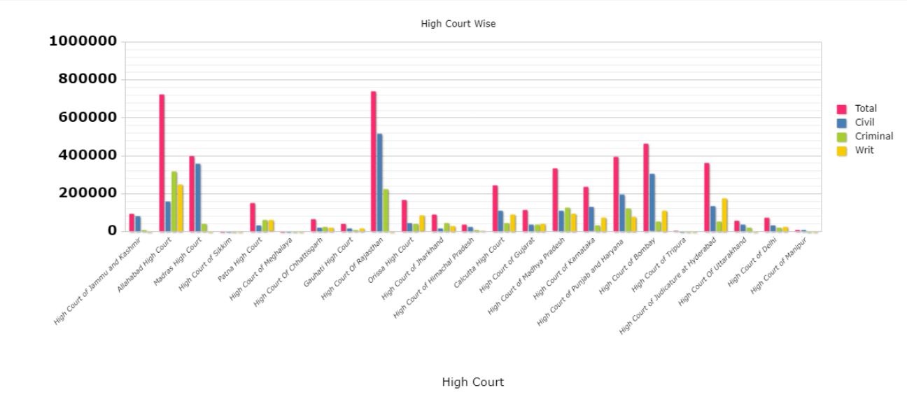 While subordinate courts account for the bulk of pending cases across courts, the backlog in the High Courts was over 49 lakh, these include over 24 lakh civil cases and over 13 lakh criminal cases, the rest being writ petitions.