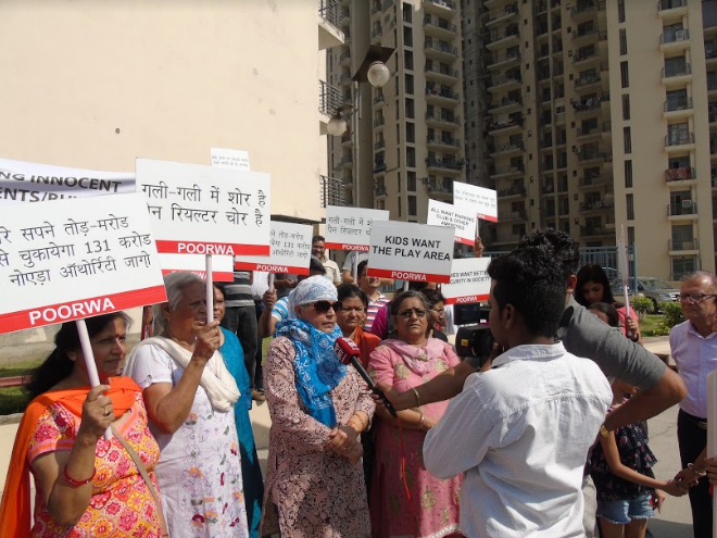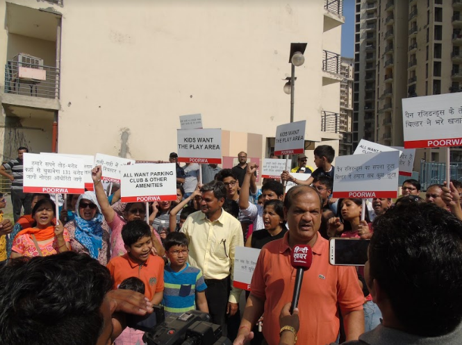 Launched in 2009, the PAN Oasis residential area in Noida, comprises of 2200 flats which are partially completed. Since 2015, residents have been moving in based on the completion of their flats. On Saturday, home buyers along with children raised slogans against the builder for not honouring their contractual obligations to the buyers.