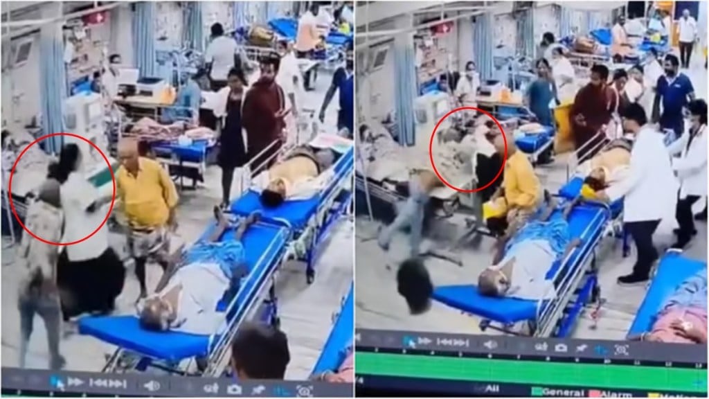 The CCTV footage shows a patient running after a doctor, grabbing her by her hair and banging her head on the steel frame of a hospital bed. Other doctors in the ward come to her rescue and the attacker was overpowered and taken away. The incident took place in a fairly crowded hospital ward.