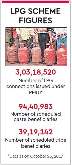 An addition of 3 crore beneficiaries would translate to a requirement of around 3 mt of LPG annually, assuming each household consumes 100 kg of the cooking fuel every year. In the last financial year, the domestic production of LPG stood at 11.25 mt and imports were to the tune of 11 mt. According to data till October 23, 2017, the three OMCs — Indian Oil Corporation, Bharat Petroleum Corporation and Hindustan Petroleum Corporation — have issued a total of 3,03,18,520 LPG connections under PMUY, of which 1,33,60,125, or 44%, have gone to beneficiaries belonging to the scheduled caste and scheduled tribe categories.