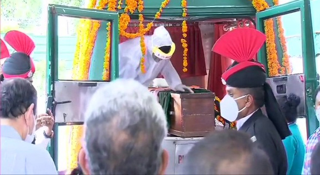 Due to COVID-19, Pranab Mukherjee's mortal remains were carried in van instead of gun carriage. 'Due to the requirement of following social distancing norms and other Covid-29 related protocols, the mortal remains of the former President were taken in a hearse van instead of the normal gun carriage,' the Defence Ministry officials told ANI.