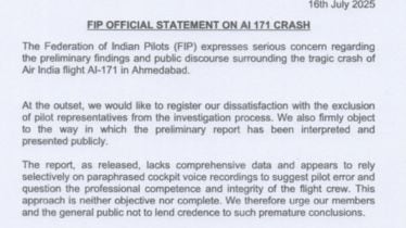 The Federation of Indian Pilots (FIP) has expressed serious concern over how the preliminary report into the Air India AI-171 crash in Ahmedabad has been interpreted and shared with the public. The pilots’ body has questioned the fairness of the investigation and strongly objected to what it calls “premature conclusions” which blame the pilots.