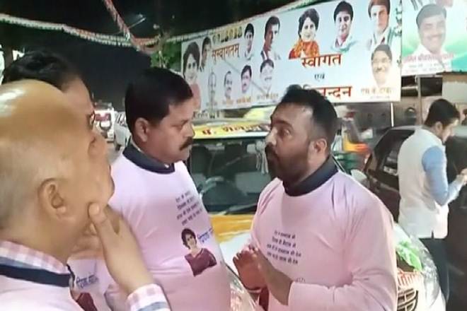 Congress workers wear T-shirts with party general secretary for Eastern Uttar Pradesh, Priyanka Gandhi Vadra's face to welcome her before the road show with her brother and Congress president Rahul Gandhi in Lucknow today.