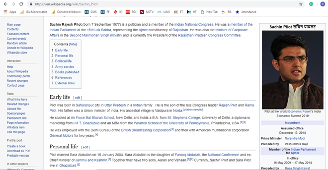 Although Pilot had emerged as the favourite in pre-poll surveys, a formal announcement of the Congress’ Chief Minister’s name is yet to be made. The personal details displayed below the image of Pilot on his Wikipedia page says that he assumed office as Rajasthan CM on December 13, 2018. Interestingly, the spelling of Vasundhara Raje reads “Veshundhra Raje”.