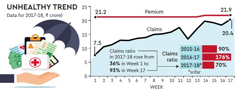 Health insurance claims in Rajasthan under the government’s Bhamashah Swashthya Bima Yojana have shot up dramatically, from Rs 7.5 crore in the first week — the current scheme began on December 13, 2017 — to Rs 20.3 crore in the 17th week, taking the current claims ratio to around 70% already (see graphic). Based on current trends, the ratio for the full year could be as high as 120% despite the fact that the premium charged rose 3.4 times since last year. In 2015-16, the first year of the scheme, the claims ratio was 90% — claims of Rs 320.7 crore were made against the premium of Rs 357.4 crore — and this went up to 176% in 2016-17.