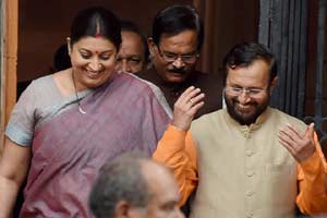 In a major rejig of the Narendra Modi council of ministers following an expansion on Tuesday, Smriti Irani was replaced as Human Resource Development Minister by Prakash Javadekar. Irani has been made Textiles Minister, replacing incumbent Santosh Gangwar who will be now be Minister of State for Finance.