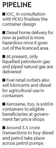 The roll-out of the plan is yet to be decided though. “Given statutory clearances will be involved in the process, we do not want to take chances as far as safety is concerned and that is why we have not thought of a date as of now for roll-out,” said Singh. Usually, such plans first undergo a testing phase before actual implementation of the programme. Singh added that OMCs may also look for change in guidelines to increase the amount that can be carried for distribution as the current limit is too small for making it economically viable. As per current rules, licence for transport or storage of petroleum class B (non-bulk) in quantity not exceeding 2,500 litres and in receptacle not exceeding 1,000 litres is not required. Class B petroleum includes diesel but not petrol.