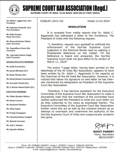The Executive Committee of the Supreme Court Bar Association (SCBA) has condemned the letter written by its President Senior Advocate Adish C Aggarwala to the President of India Droupadi Murmu urging her to stop the implementation of the electoral bonds verdict of the apex court and invoke Article 143 of the Constitution of India to seek presidential reference.