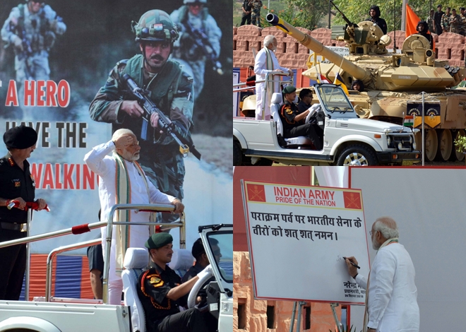 Prime Minister Narendra Modi on Friday inaugurated 'Parakram Parv' at the Jodhpur military station to commemorate the second anniversary of the surgical strikes. Upon his arrival at the Jodhpur airport, PM Modi went straight to Konark War Memorial where he offered floral tributes to the martyrs of 1965, 1971 and other wars. He then went to the Konark Stadium where he inaugurated the 'Parakram Parv'. Meanwhile, thousands of visitors flocked to the venue to have a look of the defence equipment on display.