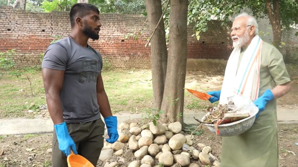 Prime Minister Narendra Modi on Sunday teamed up with fitness influencer Ankit Baiyanpuriya in a cleanliness exercise, as part of his call to participate in an hour-long “shramdaan” across the country on the eve of Gandhi Jayanti.