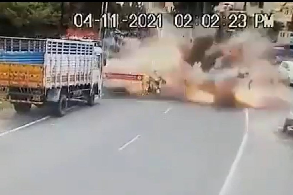 A CCTV footage released by the local police shows the deceased Kalainesan (37) driving with his seven-year-old son Pradeesh. Kalainesan was going to his in-laws’ house in Koonimedu. According to an Indian Express report, he had bought firecrackers from his hometown for selling on Diwali.