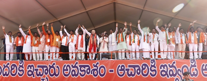 Congress president Rahul Gandhi, Andhra Pradesh Chief Minister N. Chandrababu Naidu and other TDP-Congress aleaders at a rally in Kodad, Suryapet. The state will go on Assembly poll on december 7.