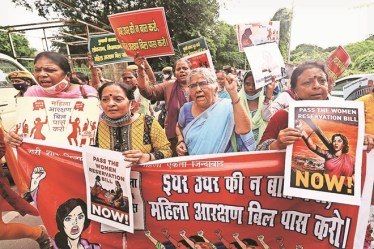 All India Democratic Women’s Association (AIDWA) workers holding a rally to demand the passing of the Women’s Reservation Bill, in Lucknow. The Constitution (106th Amendment) Act, 2023 paved way for the Women’s Reservation Act, 2023, reserving one-third of seats in Parliament, Assemblies of state and NCT of Delhi for women. | Photo credit: Express photo by Vishal Srivastav