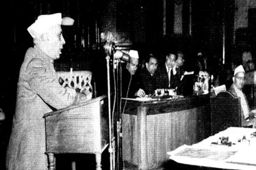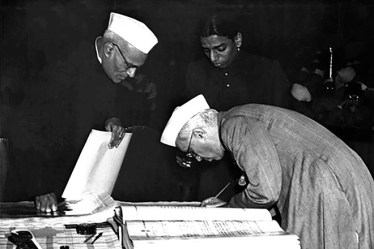India’s first PM Jawaharlal Nehru signing the Constitution of India on January 24, 1950. The Constituent Assembly was formed on December 6, 1946, with 389 members, to draft the country’s Constitution. A drafting committee, led by Dr BR Ambedkar, finalised the draft on November 4, 1947. The Constitution was finally adopted on November 26, 1949, and it came into effect on January 26, 1950. | Photo credit: amritmahotsav.nic.in