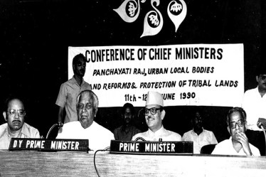 Then PM VP Singh inaugurating the conference of CMs on panchayati raj, urban local bodies’ reforms and protection of tribal lands, in New Delhi on June 11, 1990. The 73rd and 74th Amendment Acts of 1992 are crucial, as they granted constitutional status to Panchayati Raj institutions and urban local bodies. They added new parts and schedules to the Constitution to empower local governance, ensuring democratic participation and decentralisation of power. | Photo credit: Express Archives