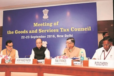 Then finance minister Arun Jaitly chairing the first meeting of the GST Council, on September 22, 2016. The 101st Amendment Act, 2016 introduced a national Goods and Services Tax (GST) to replace all indirect taxes levied on goods and services by the Central and state governments. | Photo credit: X/@arunjaitley