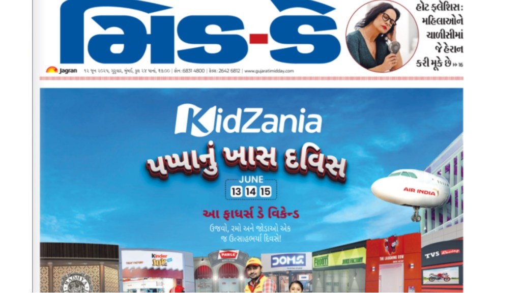 The centerpiece of the page is a vibrant advertisement for KidZania, a well-known family entertainment and learning centre. What stands out most on this page and what has caught the public’s attention in the aftermath of the Air India tragedy – is the prominent image of an Air India aircraft. The plane is depicted as part of the KidZania theme, flying out from the right side of the page, seemingly emerging from a building facade that mimics the playful, miniature cityscape of KidZania.