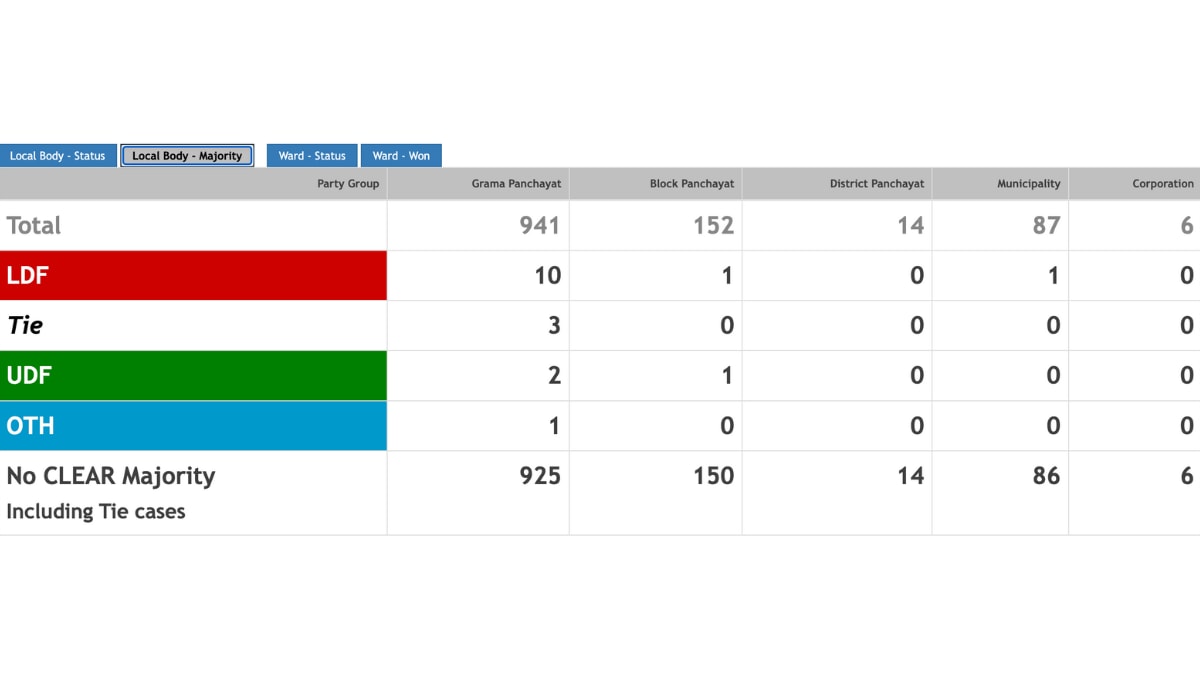 In this year’s Kerala local body elections, voting took place in 17,337 wards across 941 gram panchayats, 2,267 wards in 152 block panchayats, and 346 wards spread over 14 district panchayats. Elections were also held in 3,240 wards across 87 municipalities and 421 wards in six municipal corporations.
