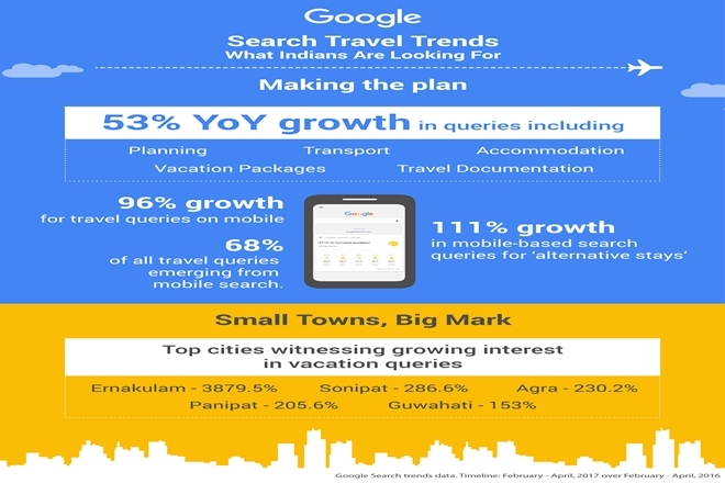 One of the major reasons behind this massive growth was the popularity of mobile devices that have made in very easy to plan and choose destinations. Another interesting trend witnessed this year is the growing interest reflected in ‘Alternate Stays’ with 111% YoY search query growth. Further, ‘destination activities’ also witnessed 102% YoY growth. Google data shows that people now choosing destinations other than metro cities. There was a growth of 70% YoY in travel queries from non-metro cities while 40.80% of all travel related queries emerging from cities and towns beyond Delhi-NCR, Mumbai, Bangalore, Chennai, Pune, Hyderabad, Kolkata, and Ahmedabad.