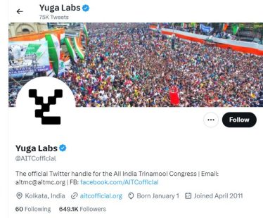 The official Twitter handle of All India Trinamool Congress (TMC) appears to be compromised as the name has been changed to ‘Yuga labs’. The display picture of the account has also been changed, and it shows a ‘Y’ logo.
